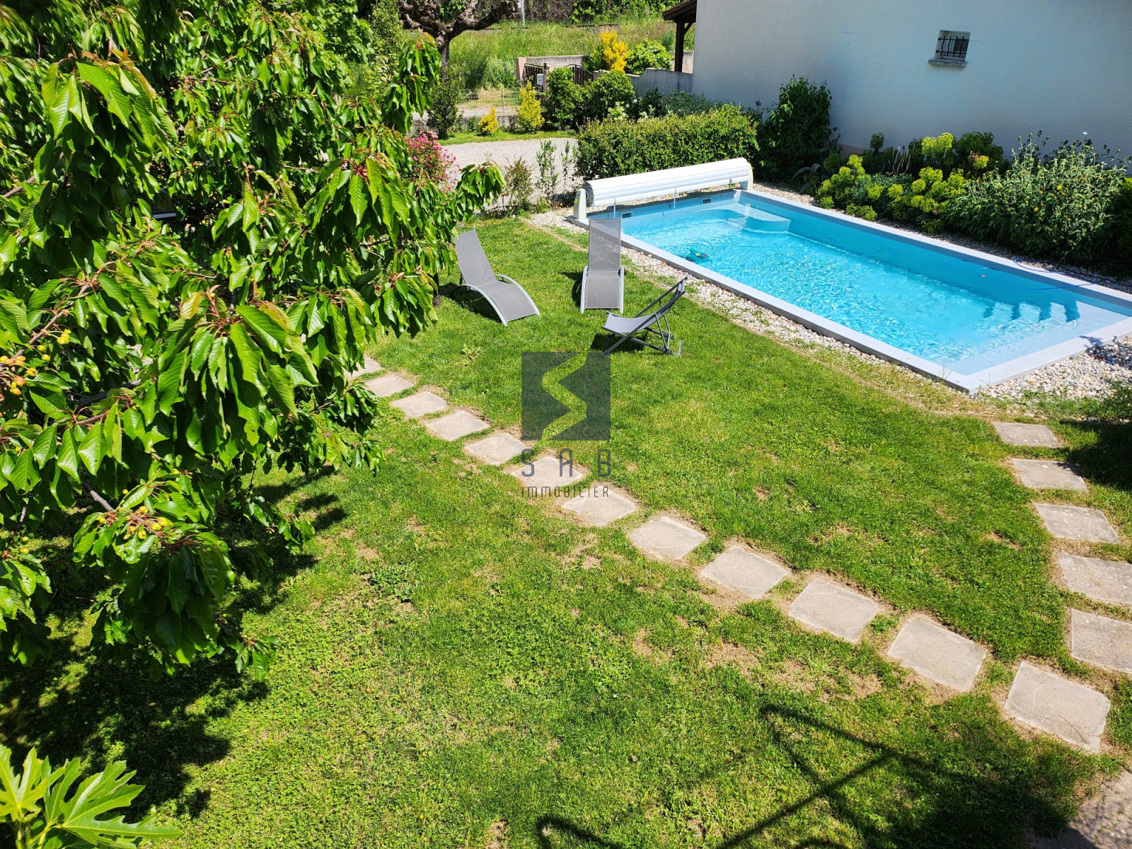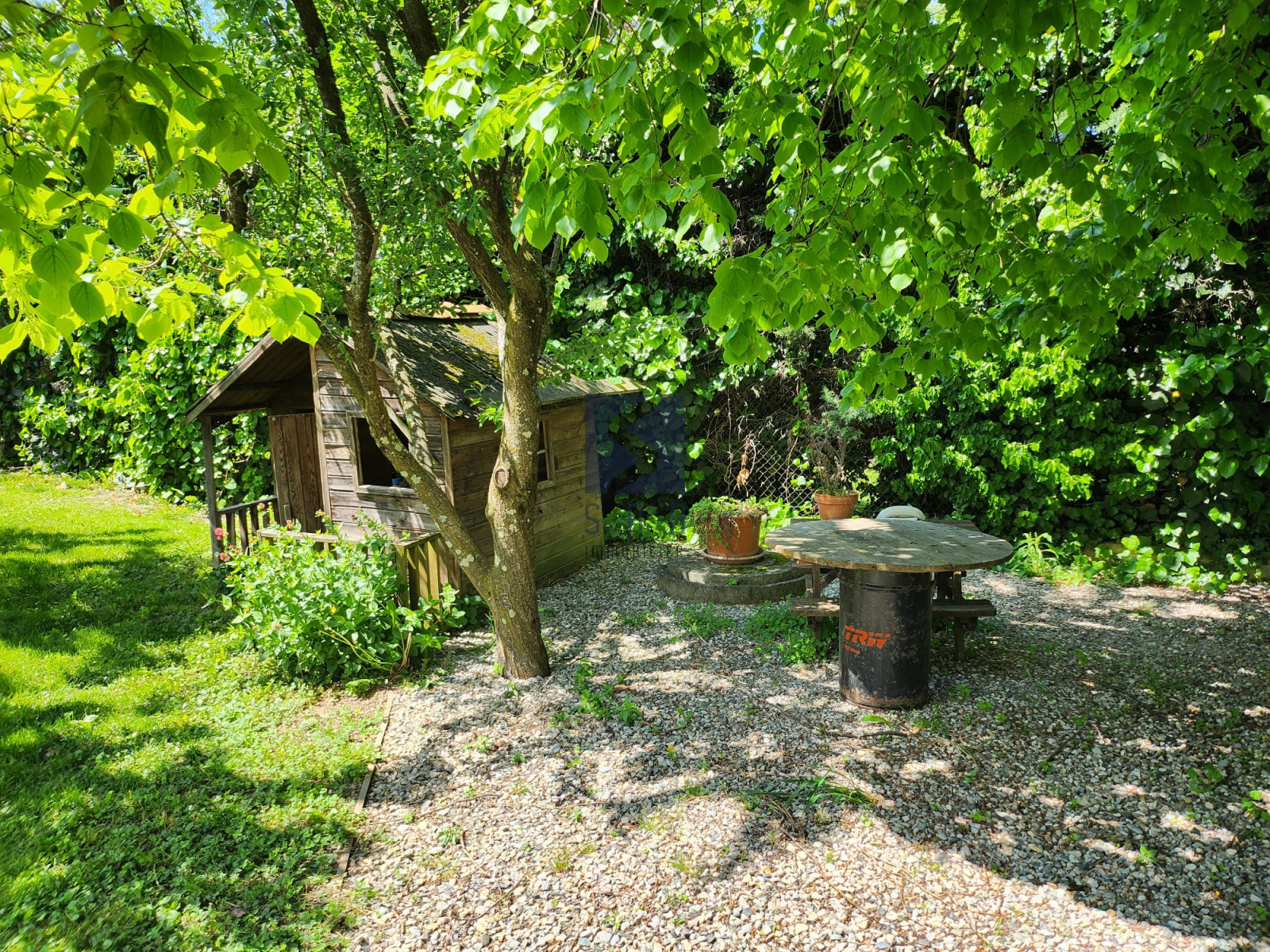 Le jardin, soigneusement paysagé, accueille un arbre centenaire offrant un ombrage naturel très appréciable en été.