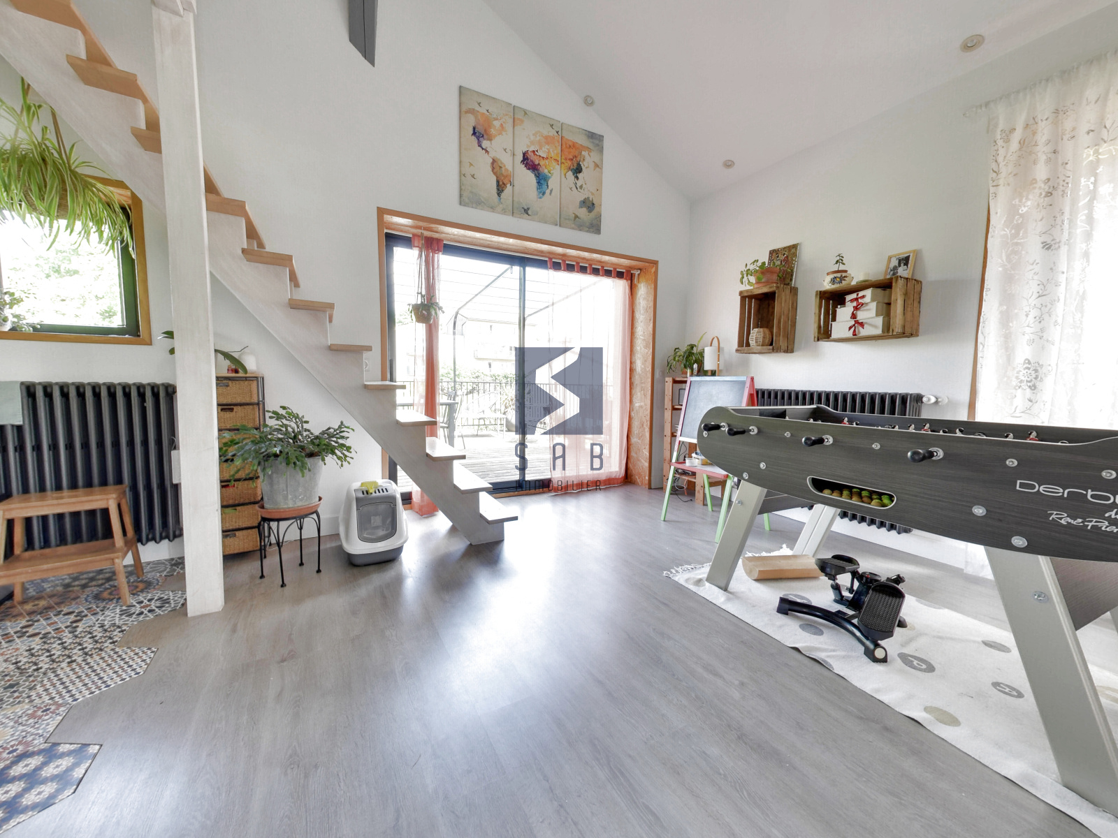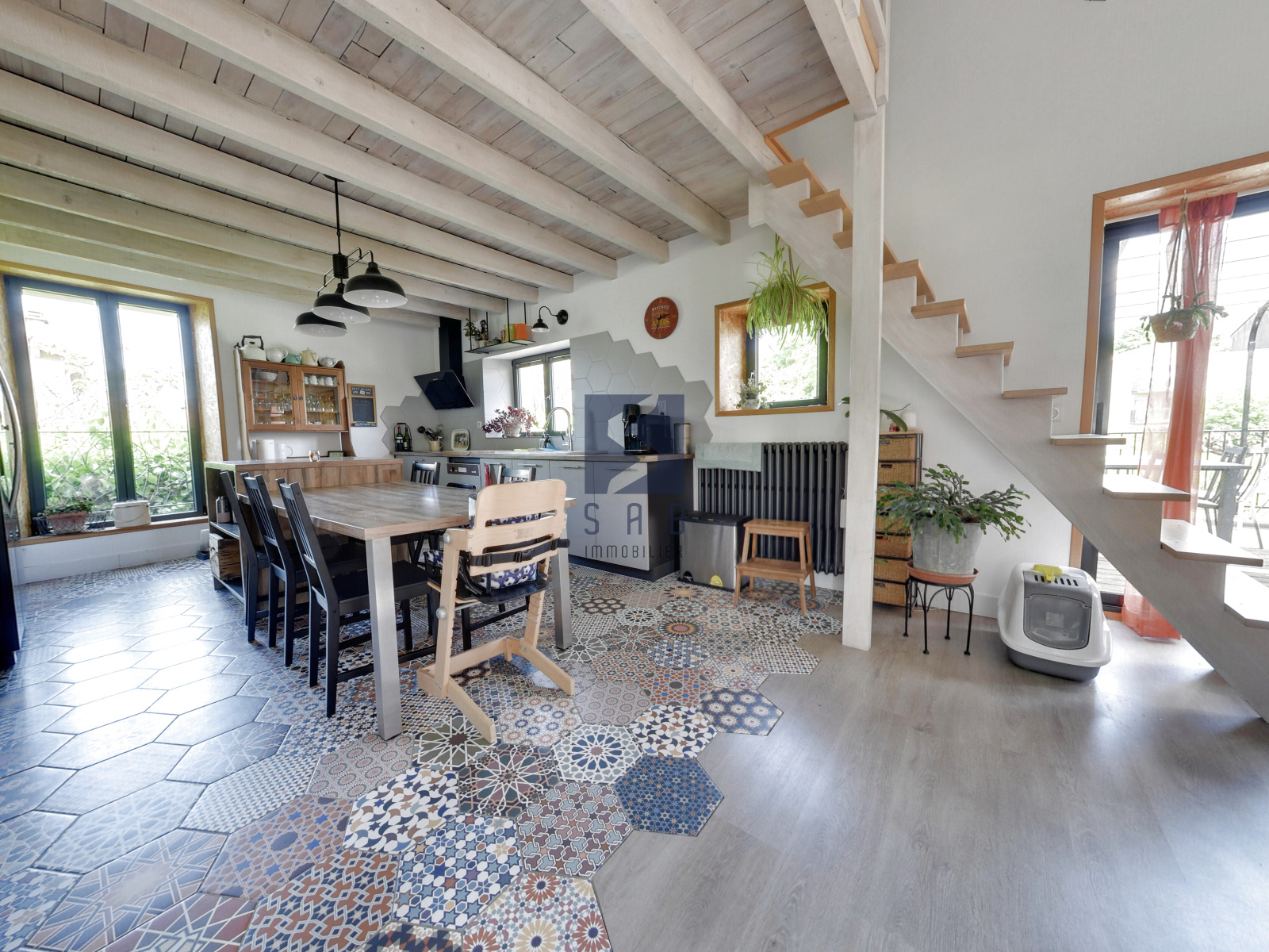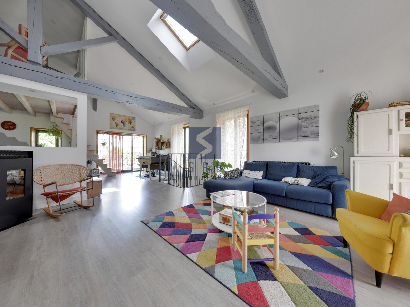 Dès l’entrée, vous serez séduit par la convivialité des volumes et la qualité de la rénovation. Le vaste séjour avec poêle à granulés s’ouvre sur la terrasse exposée sud, idéale pour les repas en extérieur.